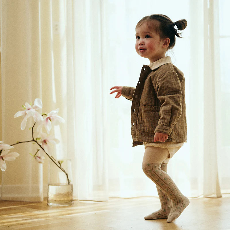Viscose-bamboo tights with a decorative folded edge from MPkids. The tights have a wide ribbed structure with cute flowers and glitter details. The tights are knitted from a soft viscose-bamboo fabric that feels wonderfully soft against the baby's skin.